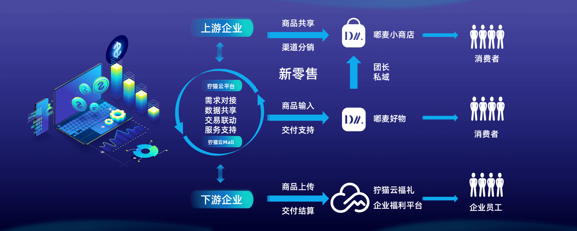 以销售、采购、库存、财务等业务为基础,链接企业数据孤岛,线上(企业专属小程序商城狞猫云Mall、分销嘟麦小商店、团购嘟麦好物)、线下(线下业务、门店)、外部(企业福利平台)业务完全融合,搭建统一运营(订单、库存、财务)的全业务流程在线服务平台